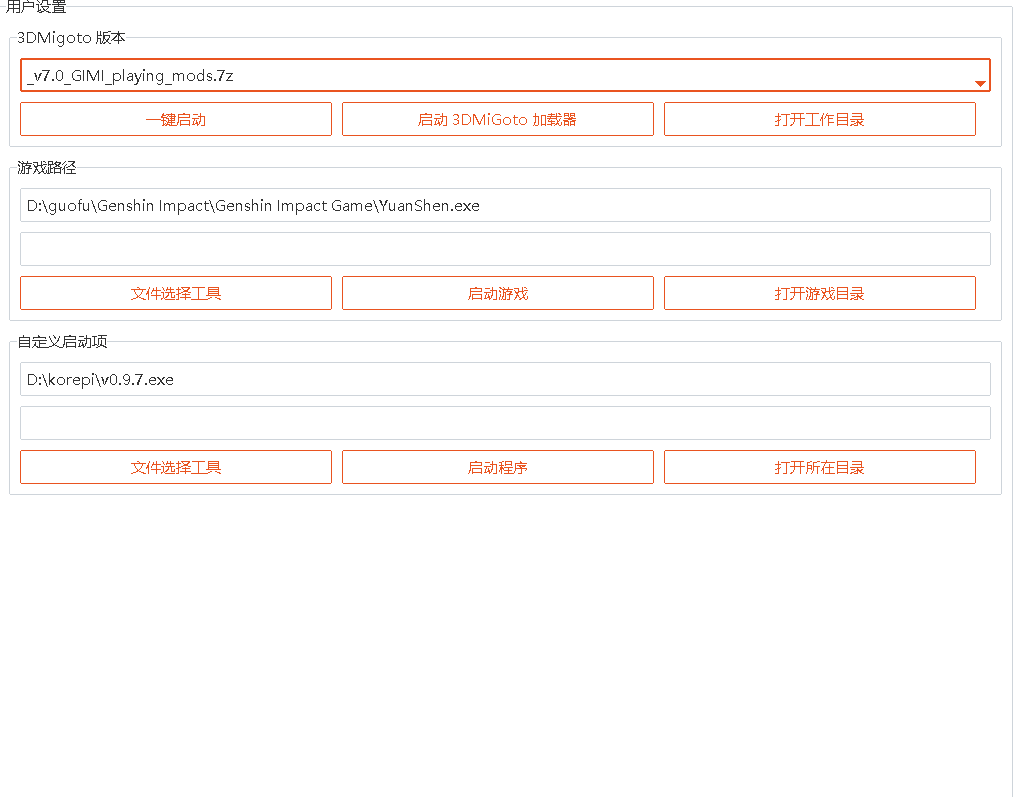 5.找到用户设置,先设置3dm版本,建议使用playing版本,然后设置游戏路径,点击文件选择工具选择自己的⚪神文件夹位置。最后在自定义选项中选择korepi的文件位置。