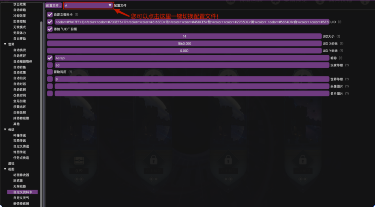 配置文件的切换 开启辅助后在功能界面的左上方切换配置(默认配置是 A,您应该可以找到 A 这个字母)